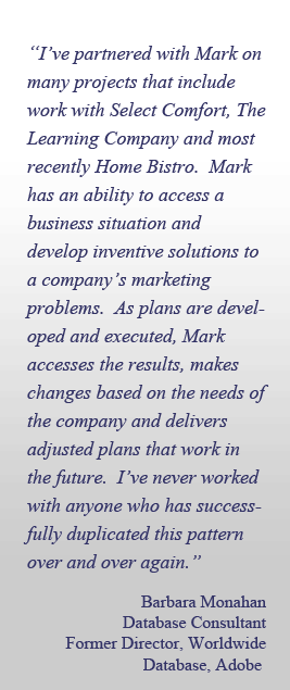 On the database management side, a competitive search was conducted for a database service agency and for a list management company. NCOA, address standardization, and file layouts were completed to insure high mailability for internal and external use. The list management company created a sales plan with the goal of protecting the customer list from competitors while generating on-going revenue though list rentals. While all this was being done, I helped transfer knowledge and experience to the internal staff.